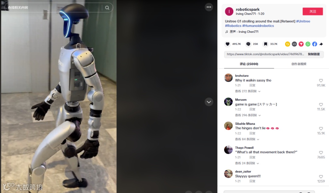 TikTok上发布的一条在商场亮相的宇树科技人形机器人视频,引起海外用户关注,点赞达49.57w,许多网友留言表示不可置信机器人竟能向人一样行动自如,带有#Unitree 标签的视频有近千条。