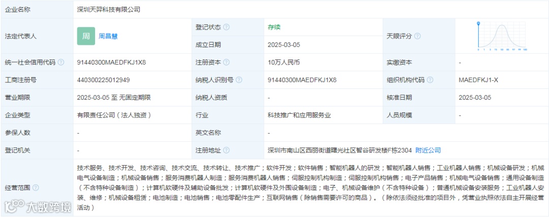大数跨境(10100.com)观察,3月5日,天眼查数据显示,深圳天羿科技有限公司成立,由杭州宇树科技有限公司全资持股。该公司主要经营范围包括:智能机器人研发与销售、工业机器人销售、服务消费机器人制造与销售等。