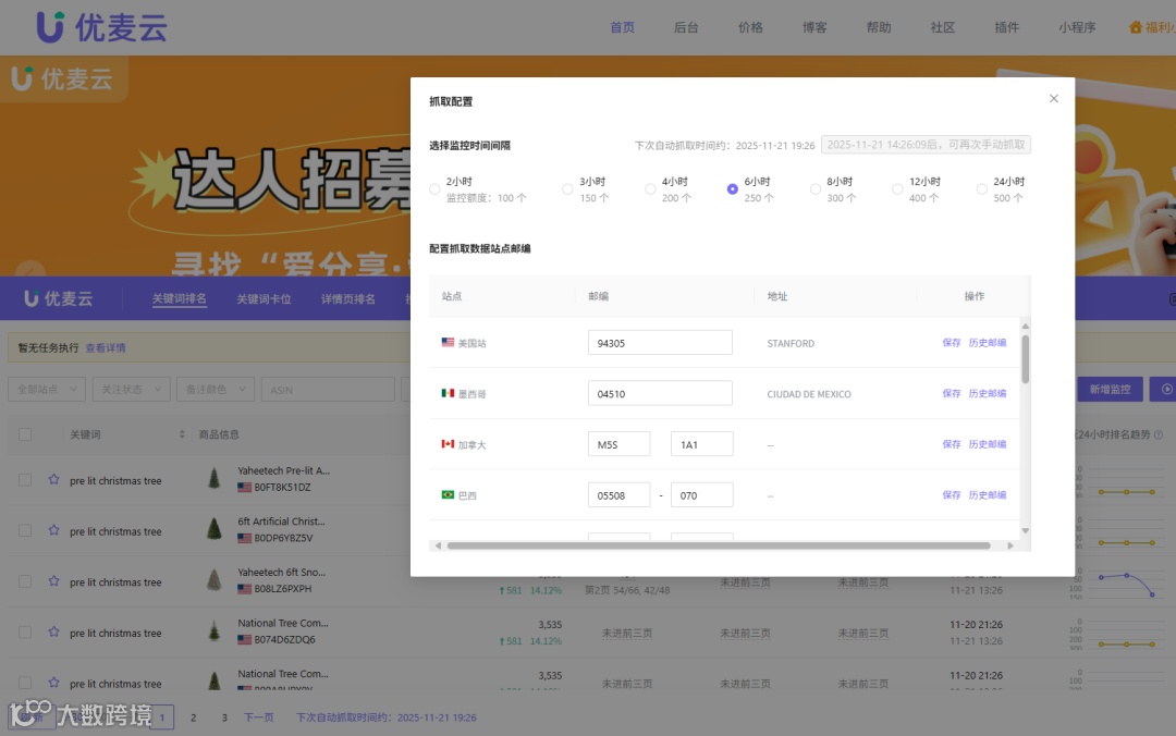 第二步,设置抓取频率。平时可能一天一次就够了,但黑五期间?直接拉到“6小时一次”,邮编锁定订单最密集的纽约和加州。