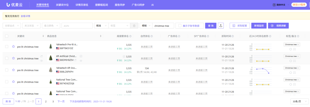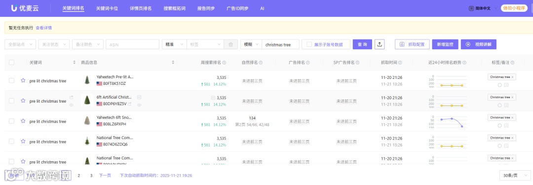 第三步:在商品监控页面,你可以看到监控ASIN在关键词下的实时表现情况。