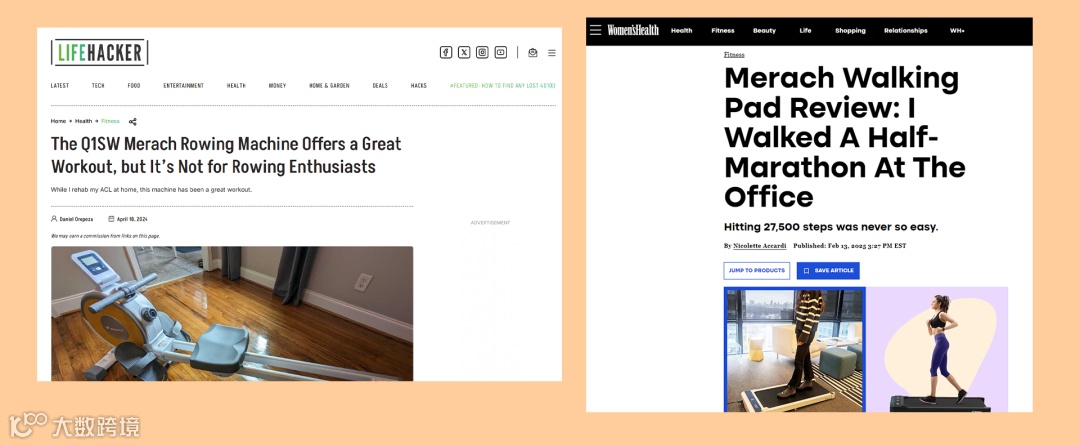 除了TikTok,该品牌还多渠道布局垂直博客,运用外媒稿件为站内流量提供补充。2024年家居博客Lifehacker上线划船机的实测稿件,称其为实惠耐用的绝佳产品。近期聚焦女性健康的细分领域博客Women’s Health推出步行垫实测文章,同样给予产品高度评价。众多实测稿件的上线为Merach Fitness在TK的火热再添助力。