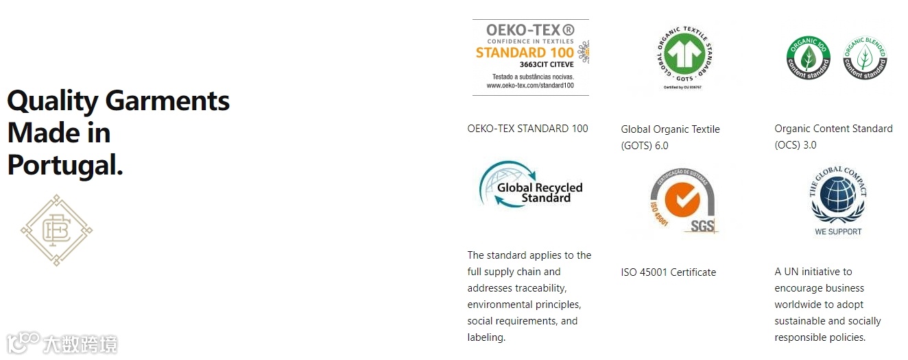 Create Fashion Brand在网站首页,展示了其所获得的大量环保认证,包括GOTS认证、OEKO-TEXR等,这些认证证明了Create Fashion Brand生产过程的环保性,所以其是能够增加对注重环保和社会责任感的客户的吸引力的,因为其是能够帮助客户提升品牌的社会形象。