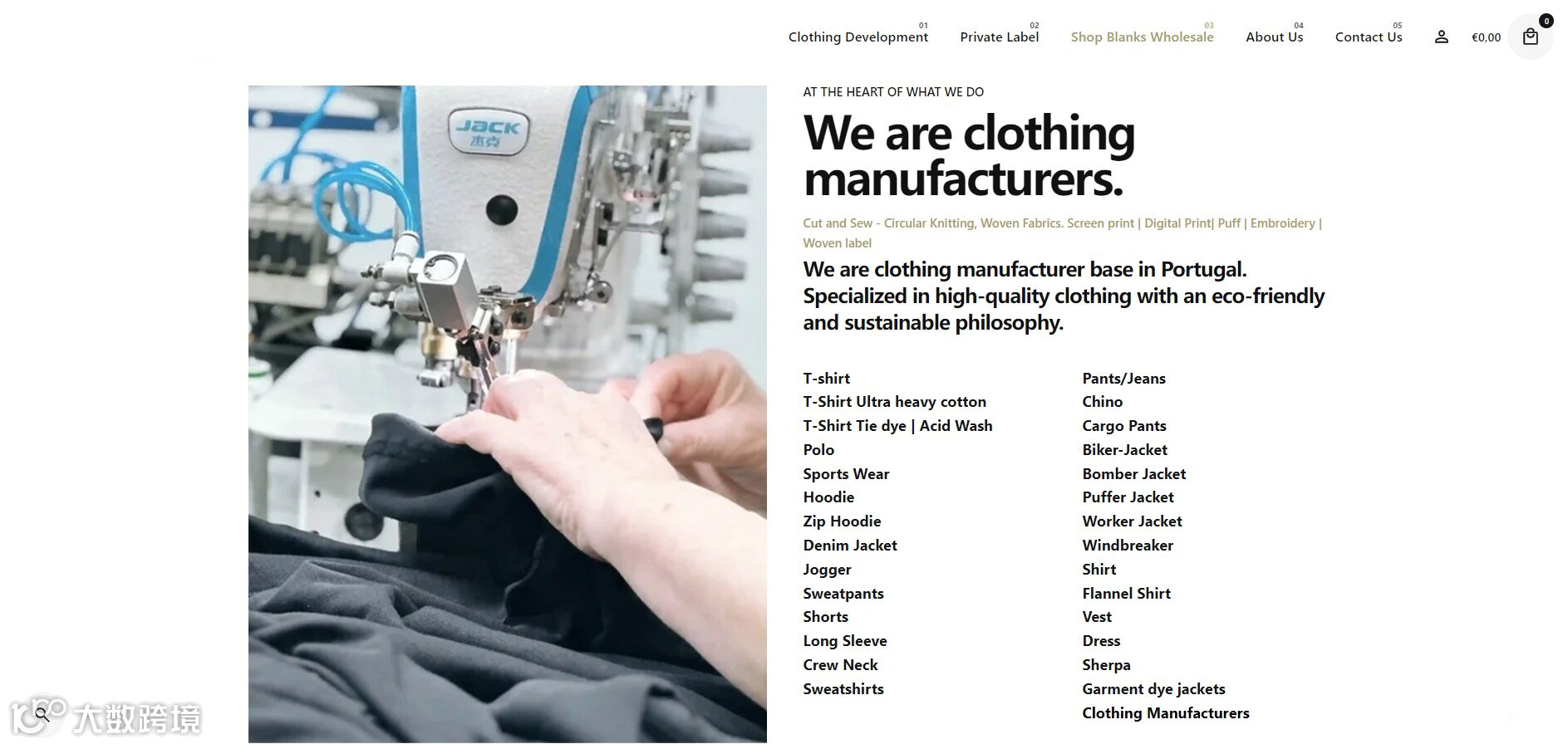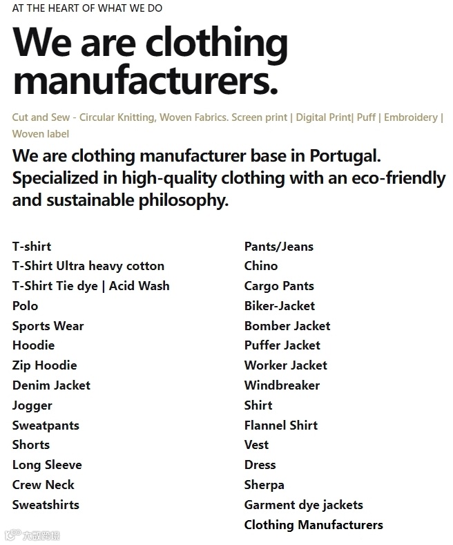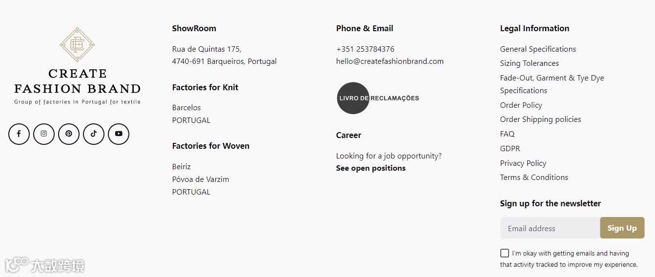 底部导航:Create Fashion Brand在底部导航中,提供了详细的地址信息,包括生产工厂的位置,特别是列出了位于葡萄牙不同地区的生产基地,这种多工厂的信息,展示了Create Fashion Brand在不同类别服装生产上的专业化和规模化能力,这是能够让客户相信其在大规模生产、灵活性方面的可靠性的。