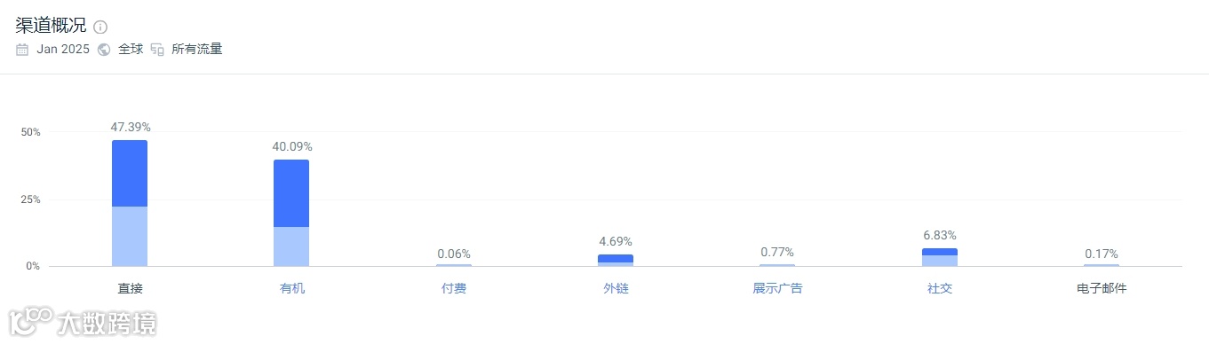 根据similarweb数据显示,Create Fashion Brand官网的流量主要来自于直接访问流量(47.39%)、自然搜索流量(40.09%)、社交媒体(6.83%)。