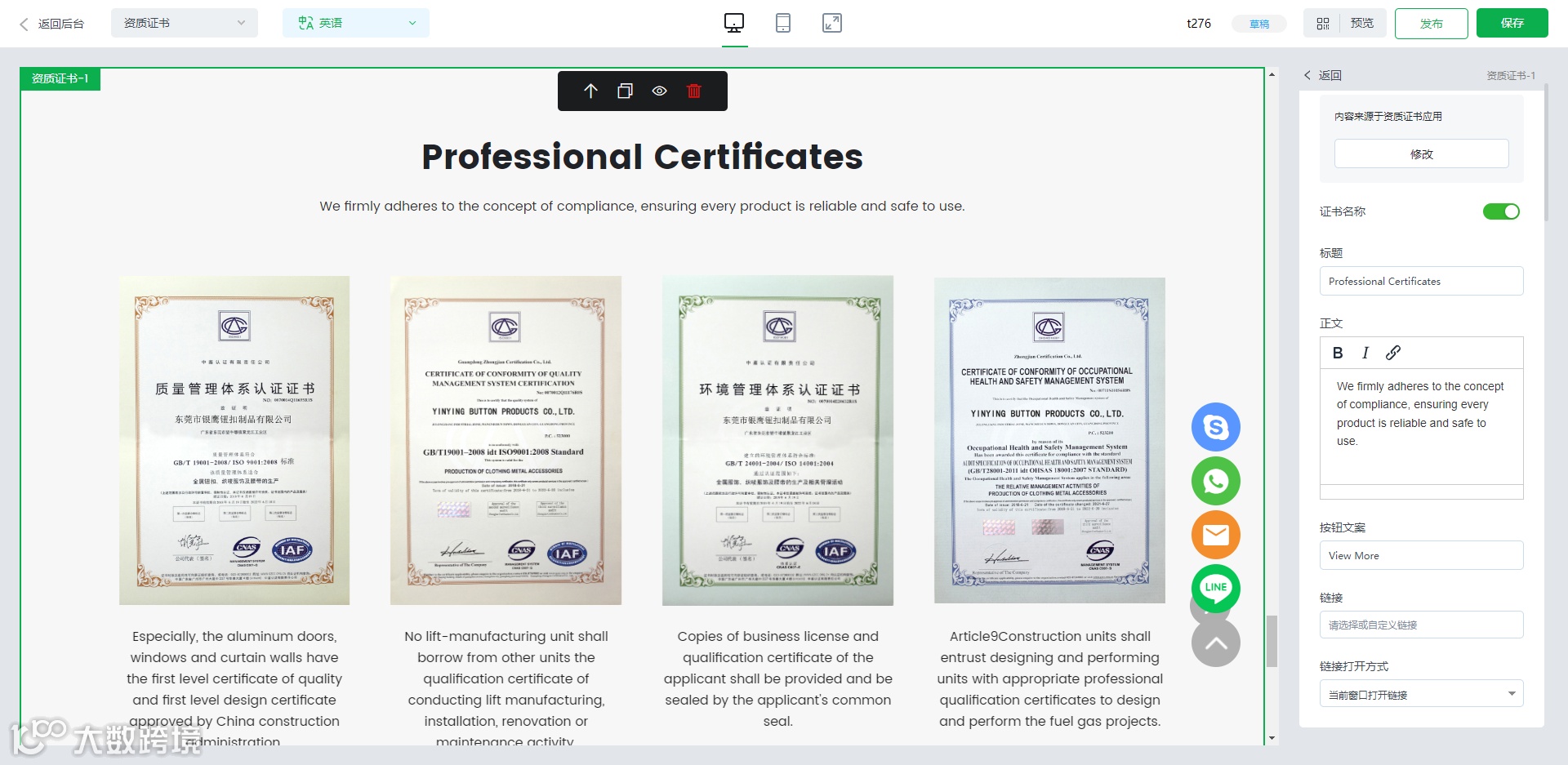 Ueeshop资质证书功能,支持卖家在独立站上展示过往获得的各种许可认证和行业资质,这不仅有助于突出企业的专业优势,还能增强客户信任感。通过清晰地展示认证信息,卖家也能证明在质量、合规性以及行业标准上的严格有效,从而有效降低客户的疑虑,促进潜在客户转化。