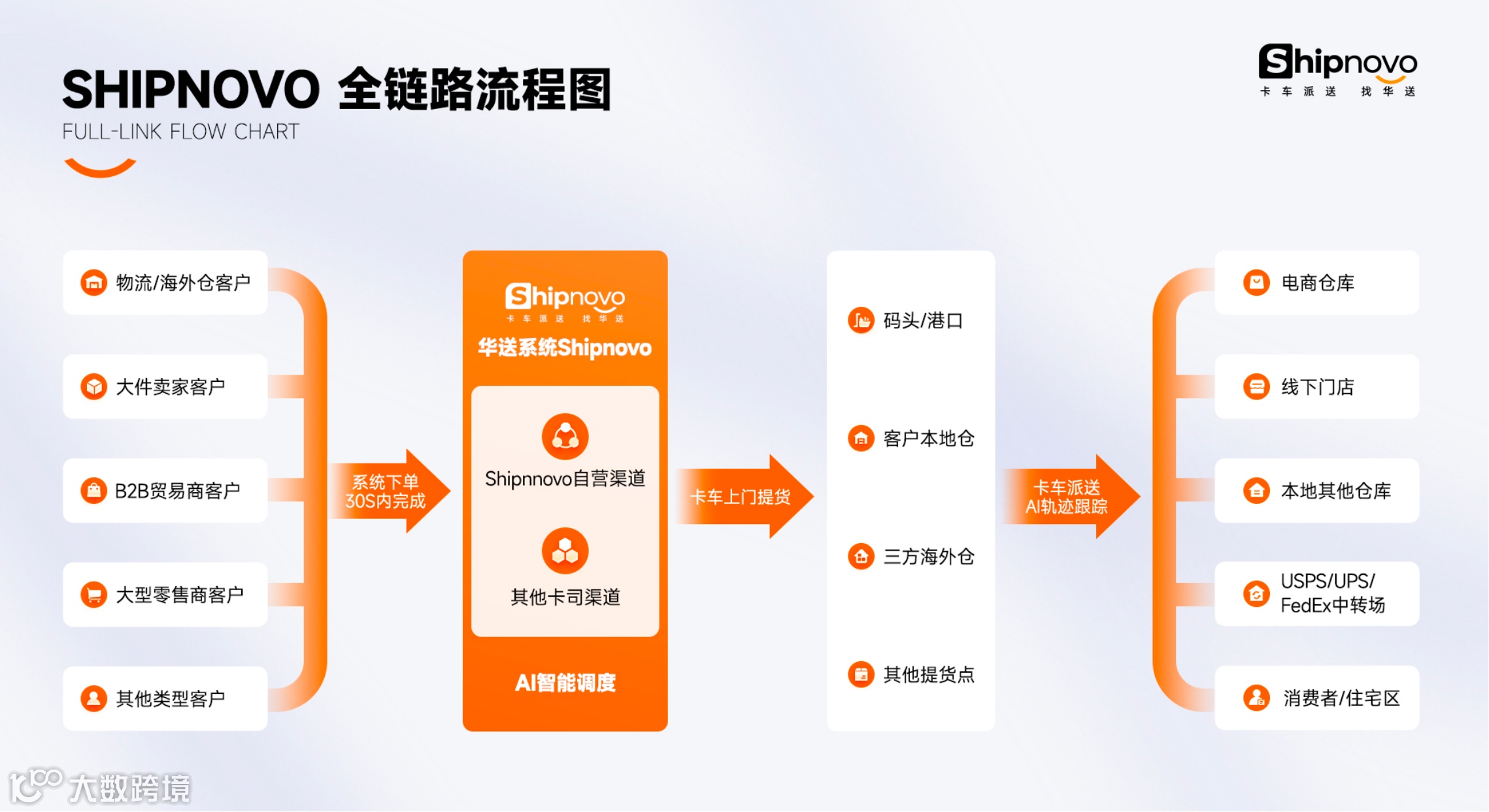 公司依托AI技术为基础,打造Shipnovo车货匹配平台,结合美国当地优质的卡车资源,拥有自调度车辆2000+,为物流、海外仓、跨境电商卖家、B2B贸易商等出海企业提供“一站式、全场景”的卡车运输解决方案。