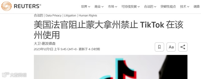 路透社报道称,在当地周四晚间,美国法官叫停了蒙大拿州在全州范围内禁止使用TikTok的禁令生效,并称该禁令违反了用户的言论自由权。