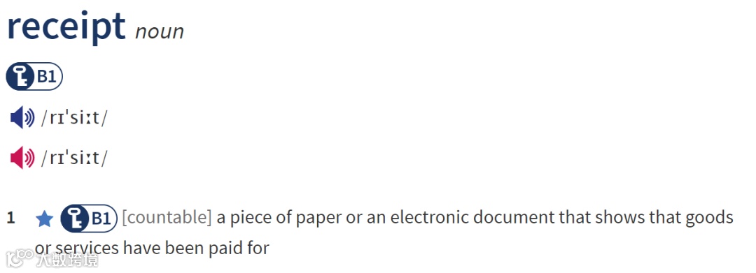 英文释义:a piece of paper or an electronic document that shows that goods or services have been paid for