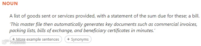 意思是:已发送的货物或提供的服务的清单,并附有应付款总额的说明;简单来说,就是一份清单。也就是说,invoice相当于“bill ”,啥叫bill?餐厅吃完饭服务员递上来的账单就叫bill,本质就是费用清单,就意味着你该付款了。