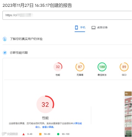 借助Google Page Speed Insights对网站进行检测,我们只需要在输入框输入想要检测的网址,就可以获得一个0-100的评分结果。