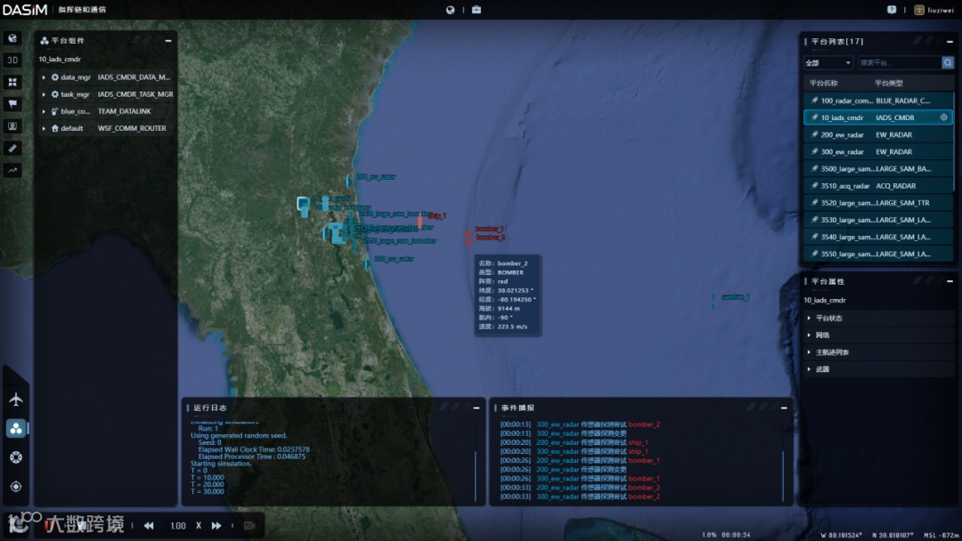 DASIM数字战场平台以信息系统建模为核心,基于 并行离散事件仿真引擎,采用多分辨率及组件化建模技术,对陆、海、空、天、网、电等各类作战平台、装备、行为、环境进行建模,支持全域、协同、智能的数字战场仿真和感知、判断、决策、行动(OODA)全流程闭环仿真。