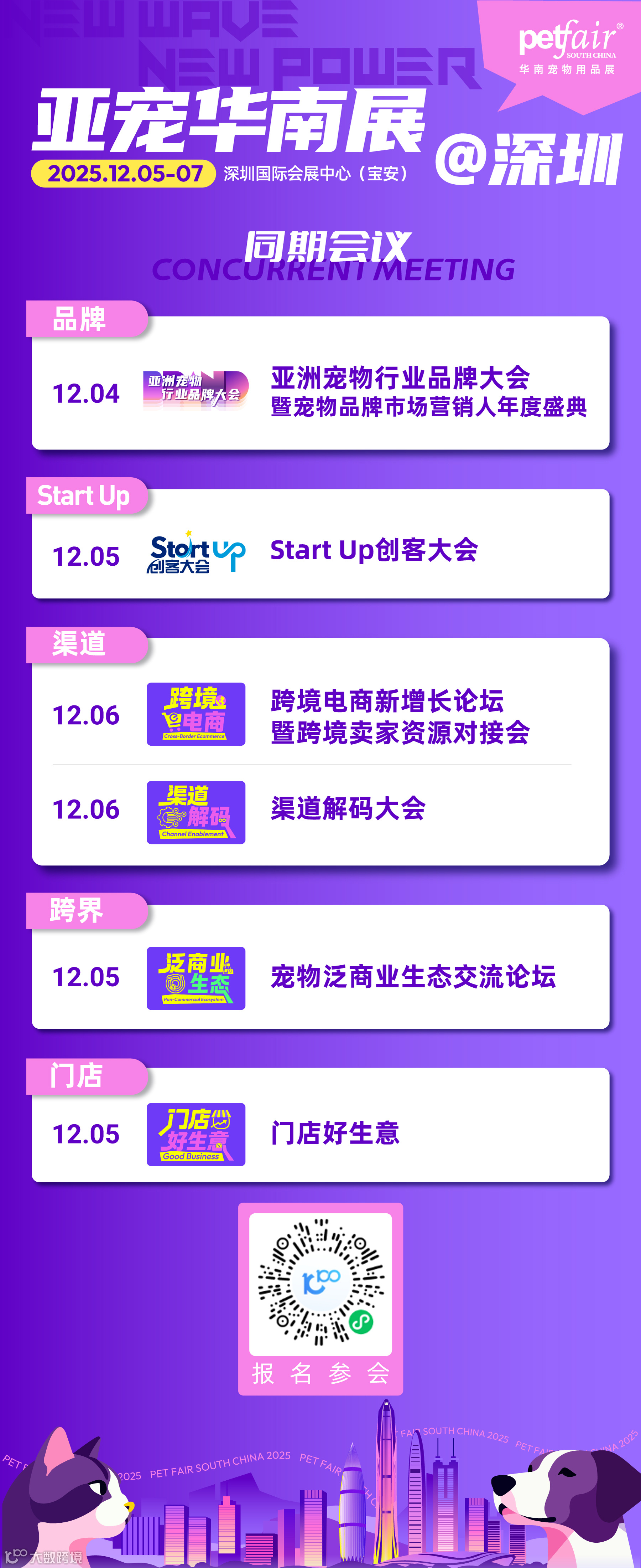 2025亚宠华南展同期将举办「Start Up创客大会」聆听初创者从0到1的有温度的创业故事;「跨境电商新增长论坛」分享东南亚跨境商机、热门国家蓝海类目、跨境平台的选品策略和爆品营销打法;「宠物泛商业生态交流论坛」探讨人宠友好泛商业共赢模式、联动挑战和未来商机,促进宠物行业与不同商业业态的合作共赢;「渠道解码大会」为品牌分享渠道建设经验、各区域市场特色;「门店好生意」探讨宠物门店新业态和零售模式,分享实操技能、日托养护、小宠异宠经营创收案例。