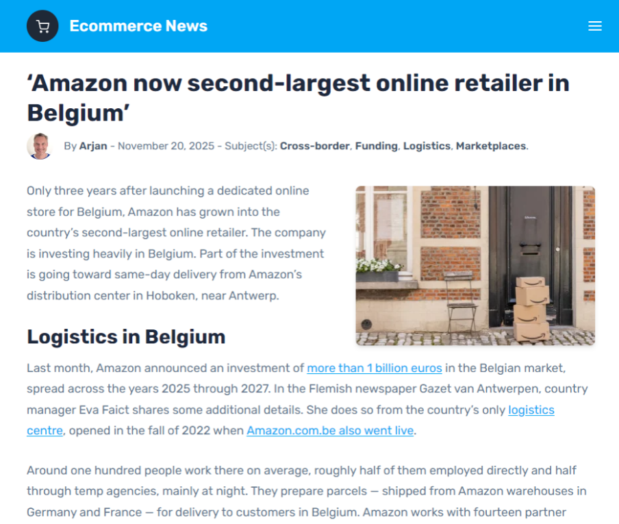 亚马逊表示,比利时的物流设施仍有较大扩展空间。为了以丰富的商品选择、低价与快速交付吸引更多比利时消费者,上个月,亚马逊宣布将在2025年至2027年间向比利时市场投资超过10亿欧元,以扩大业务与履约能力,并在三年内向荷兰投资超过14亿欧元。