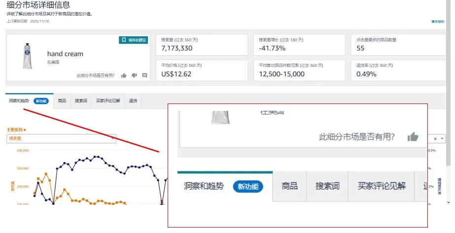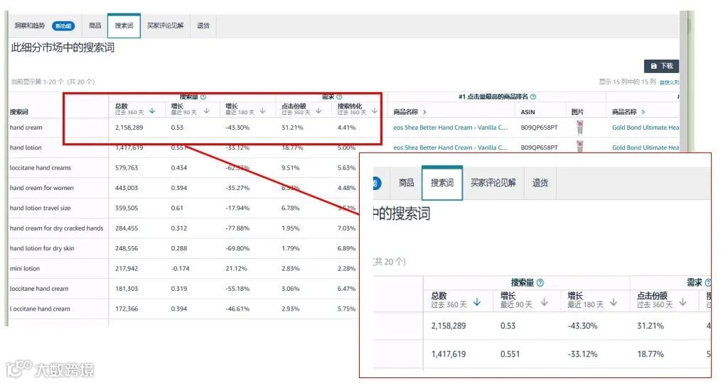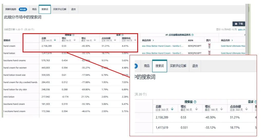细分市场详细信息,洞察和趋势、商品、搜索词、买家评论见解。细分市场中的洞察和趋势更直观的折线图,搜索转化率在9-10%。搜索词查看点击份额发现最热门的产品,护手霜点击份额是31.12%。重点关注搜索量和搜索增长指标。