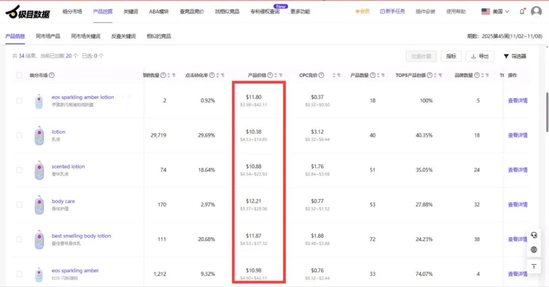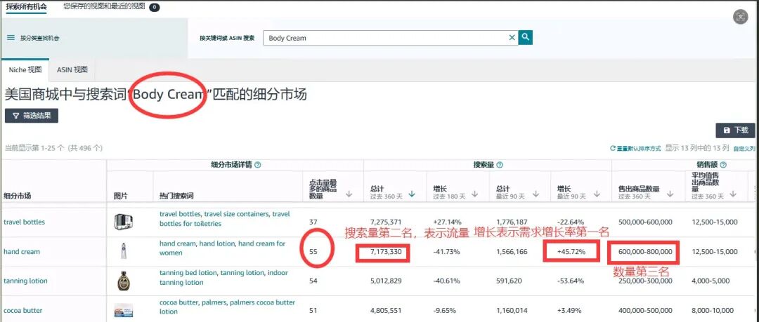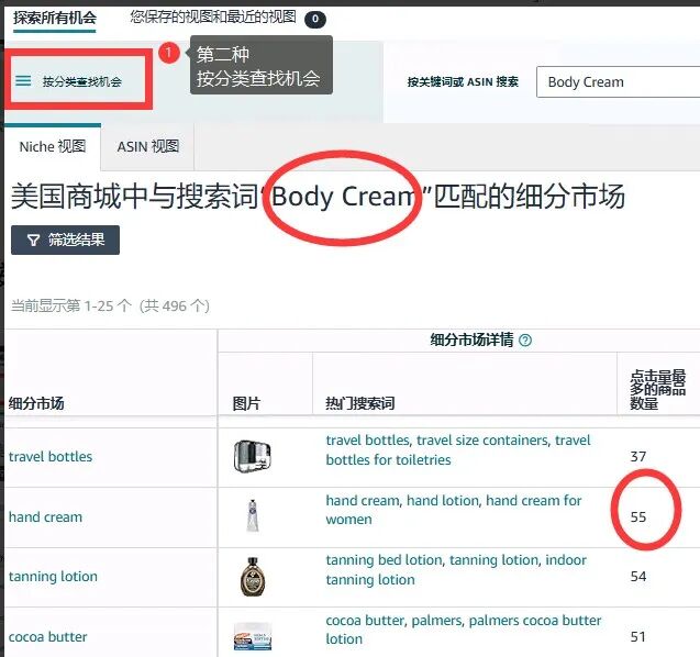 以 Body Cream为例子,美国商城中与搜索词“Body Cream”匹配的细分市场。按照售出商品数量排名过去一年1,000,000+选择细分市场lotion。身体霜满足多个细分市场。