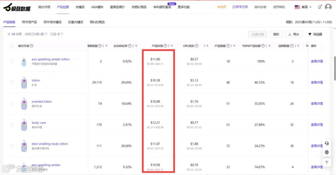 护手霜在高平均产品的点击分额中高价产品的点击份额较高,说明客户关注质量品牌评价产品知名度等作为购买的条件,所以可以原因多花几美金支付购买高价产品。如果低评价产品点击份额占比高,说明客户关注产品价格追求性价比,所以你的产品定价不能过高,否则你的链接销量数量会特别少。