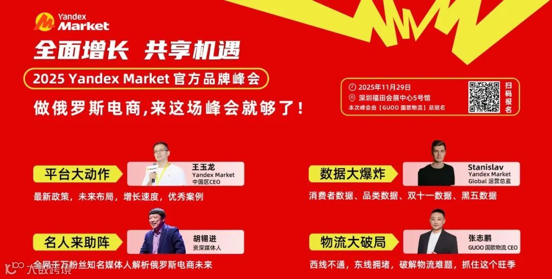就在卖家们纷纷猜测截图主人的真实身份时,Yandex Market官方已经成功邀请到他出席“2025 Yandex Market官方品牌峰会”,峰会将于11月29日在深圳福田会展中心举办,由Yandex Market主办,GUOO国欧物流总冠名,天府盛物流晚宴冠名。这位神秘大卖将现场分享“双十一”大促的成功经验,以及他们是如何实现品类霸榜的运营策略。除此之外,平台将在现场首发FBP等多个重要项目,更邀请了全网千万粉丝知名媒体人胡锡进开幕致辞!开启俄罗斯电商,参加这场峰会就够了!