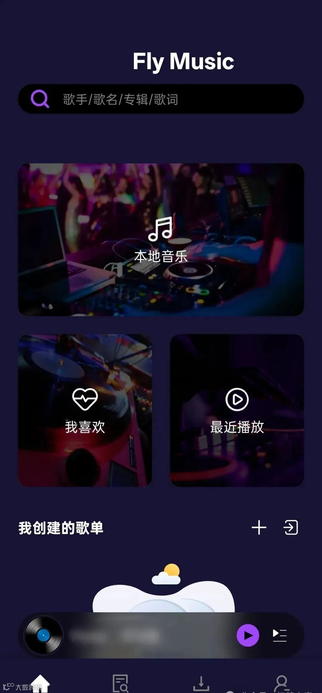 首页划分为四大部分,包括歌单、本地音乐、我喜欢,最近播放。也支持将其他音乐平台的歌单链接导入到本软件中。