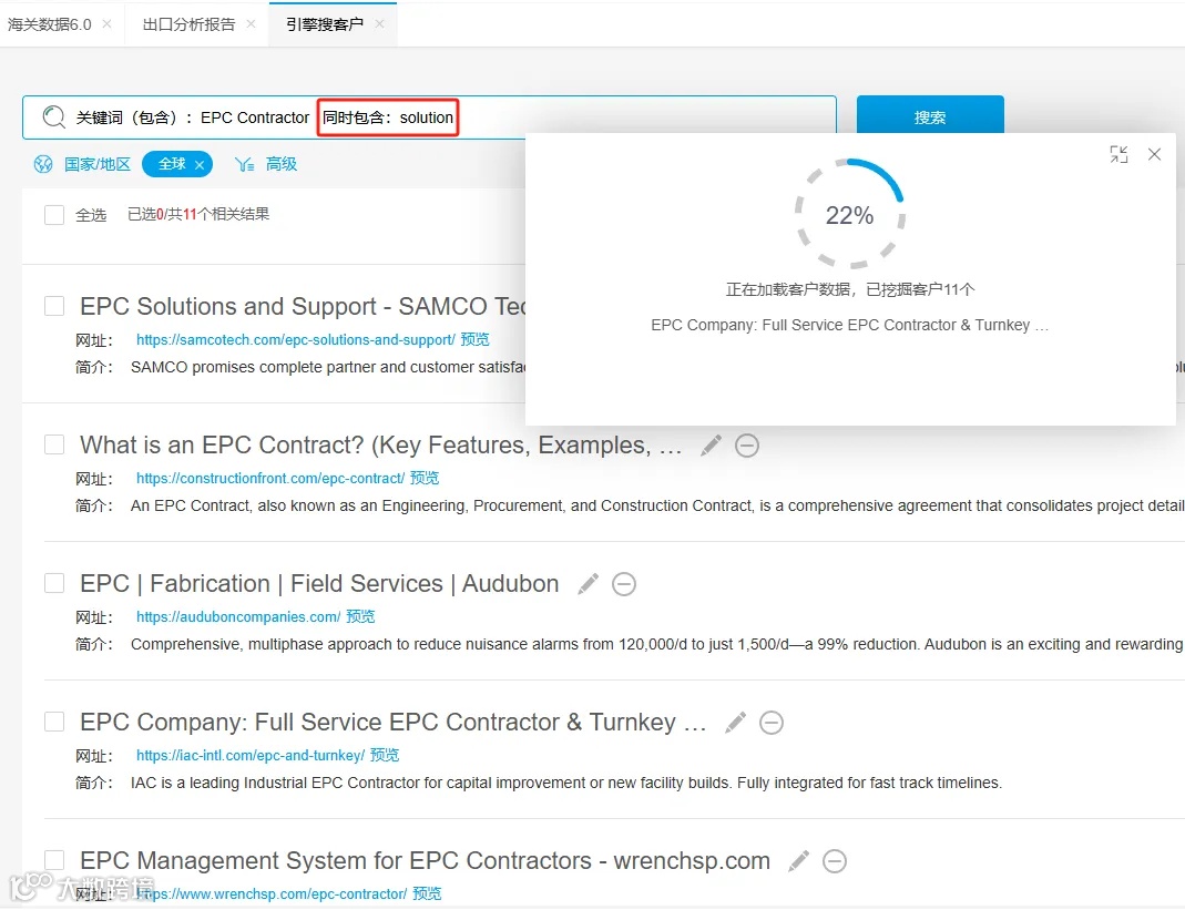 根据我客户在官网上对自己的描述里,有solution这个词,我想海外的企业应该也会说明自己是某某解决方案, 使用关键词组、上外贸客户开发软件来测试,例如