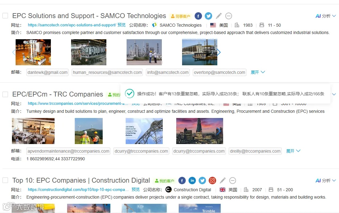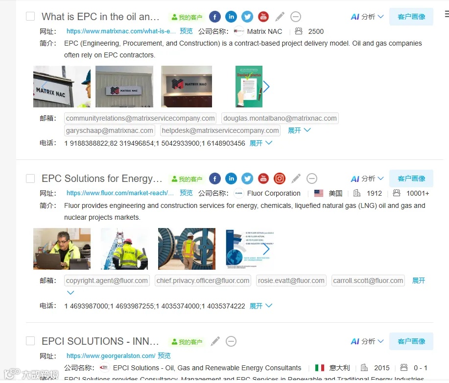 上外贸客户开发软件的好处是, 可以过滤掉很多非企业类型的网站,并且直观展示产品图片、并结合了AI分析。这一次有进步,但发现各行各业的EPC工程公司都有,截图有限,仅为部分列子。