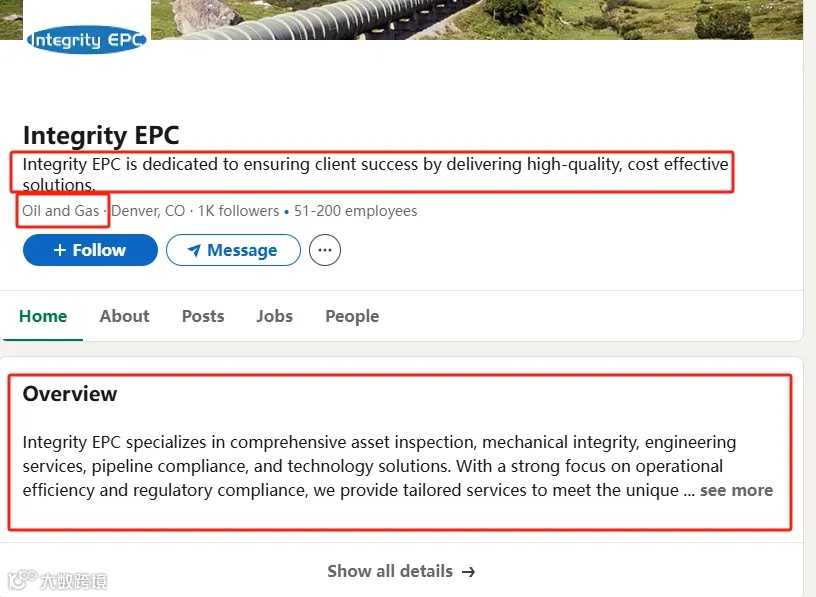 我们从这些目标客户群体的领英介绍里,可以获取到共同的关键词 “oil&Gas”