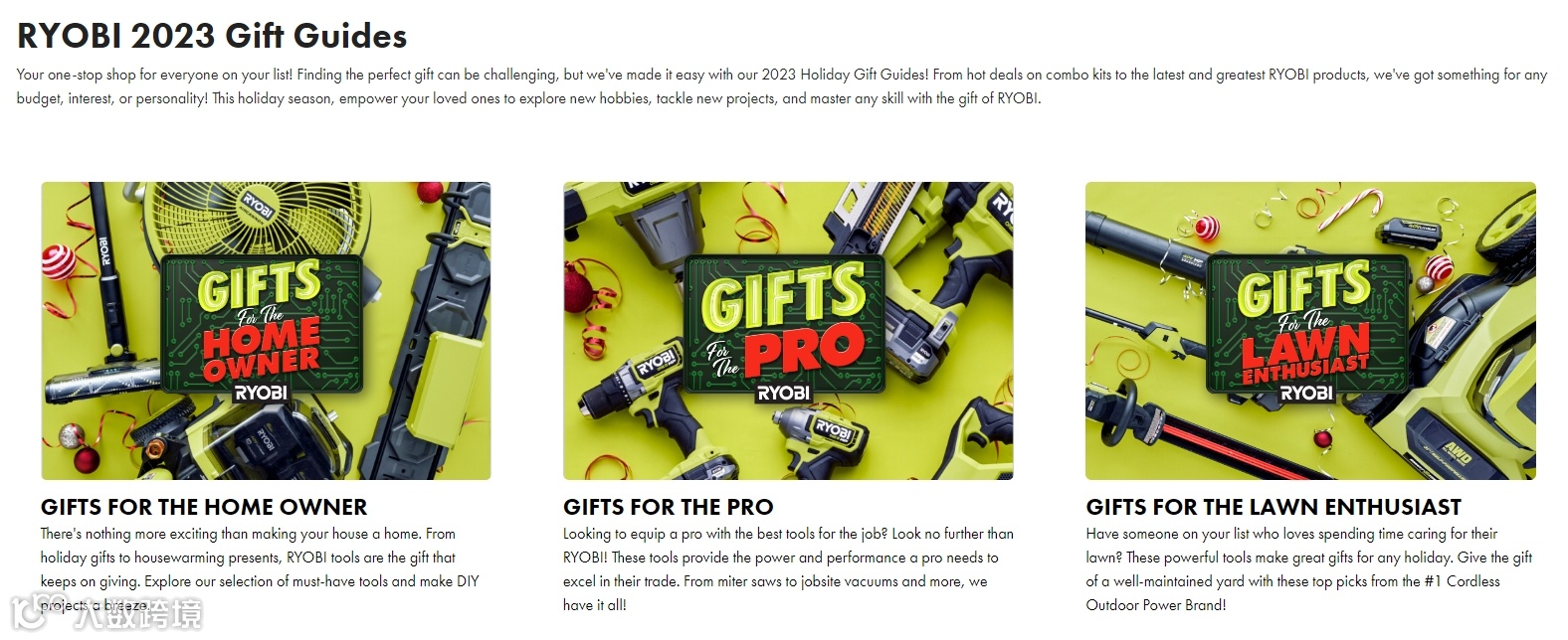 礼品指南:Ryobi提供的工具类产品是非常多的,其适用的场景不同,所需人群也有所不同。因此Ryobi在网站中添加的送礼指南,按照人群进行详细划分,是能够辅助消费者决策的。此外,这也能够增加指定产品的曝光,进而增加特定产品的销量。