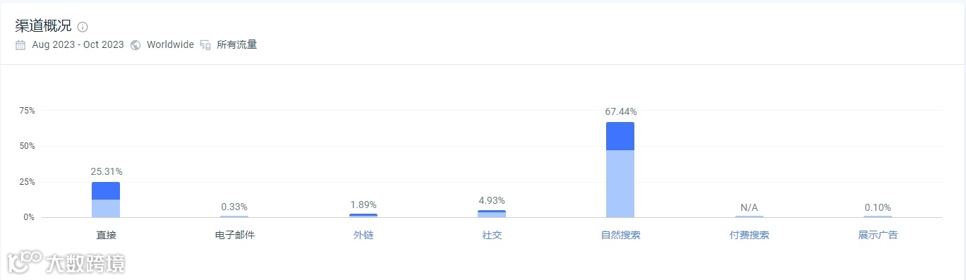 根据similarweb数据显示,Ryobi官网的流量主要来自于自然搜索流量(67.44%)、直接访问流量(25.31%)、社交媒体(4.93%)。