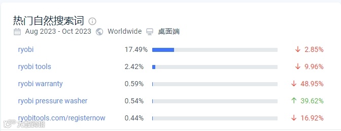 自然搜索关键词:根据similarweb数据显示,Ryobi所选择的自然搜索关键词,基本上是与其品牌相关的,这意味着其是有较高的品牌知名度的。但对于跨境卖家来说,在初期品牌知名度较低的时候,更多还是应该做行业长尾关键词,这些关键词难度较低,流量也相对可观。