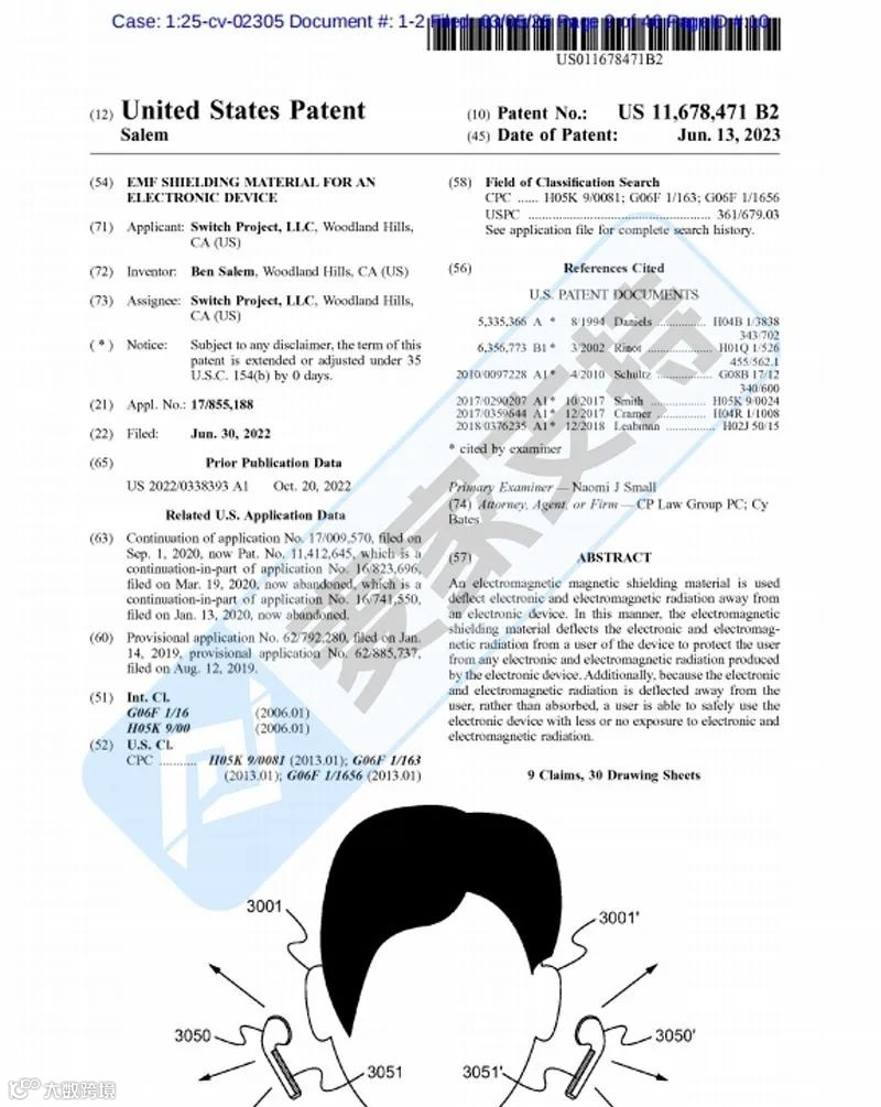 本案是Hansen Reynolds LLC律所代理Switch Project, LLC发起的一起发明专利维权案件,涉案专利号为:11678471,一款EMF电子设备屏蔽贴,原告指控被告侵犯其专利技术。