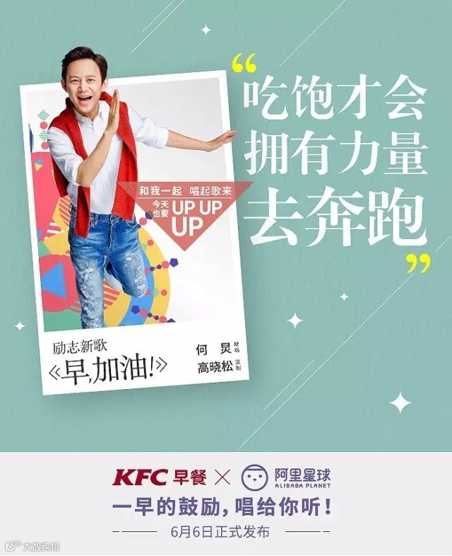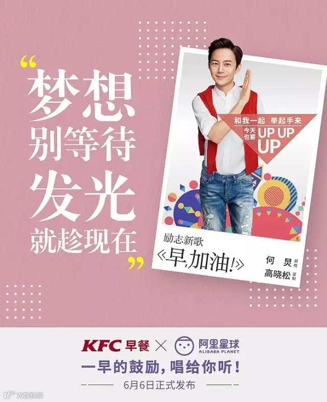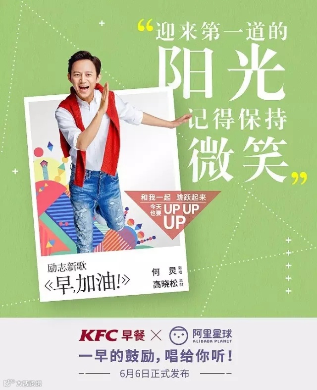看看四张海报下的文案,KFC早餐X阿里星球,一早的鼓励,唱给你听!虽然早晨从不在肯德基吃早餐,每次都是带着耳机去买早餐,但是仍能想象到清晨那快乐的节奏。