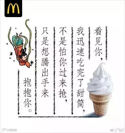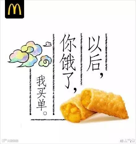 相反作为同行业的竞争对手,麦当劳的文案海报一直是业内人谈的多喜得很的,因为他们的文案都是走心型,从人所接触的点点滴滴出发去展现和表达,从麦当劳的“跟我走 /鸡翅 /管够” 给吃货的三行情书,到最近新出的“麦麦全席”,不知道看完这些海报文案,在你心中,谁家更略胜一筹~