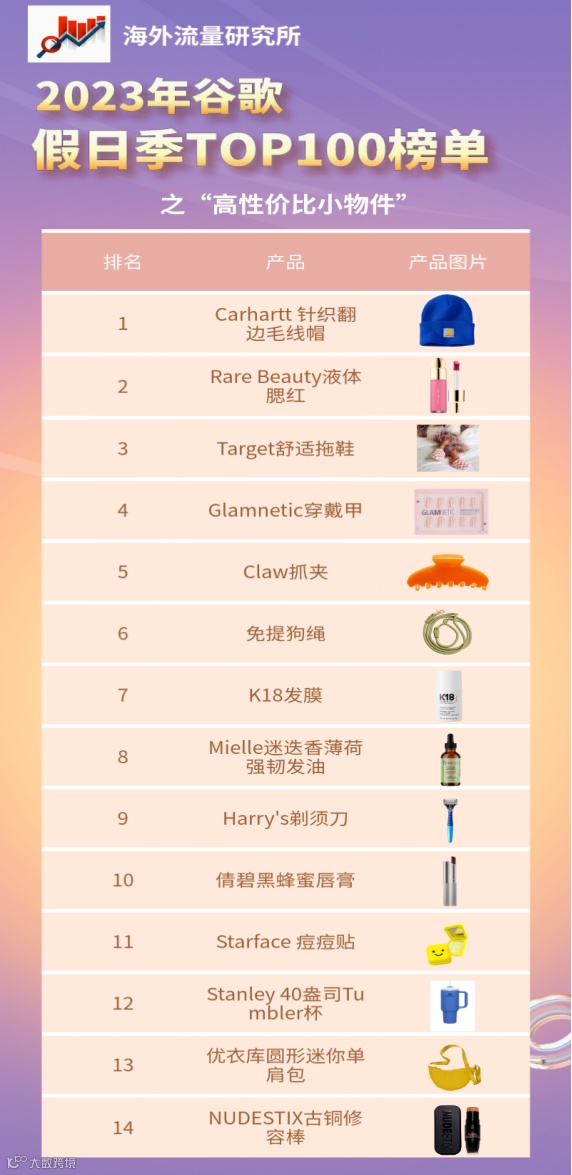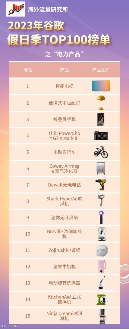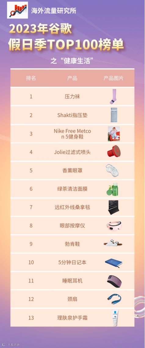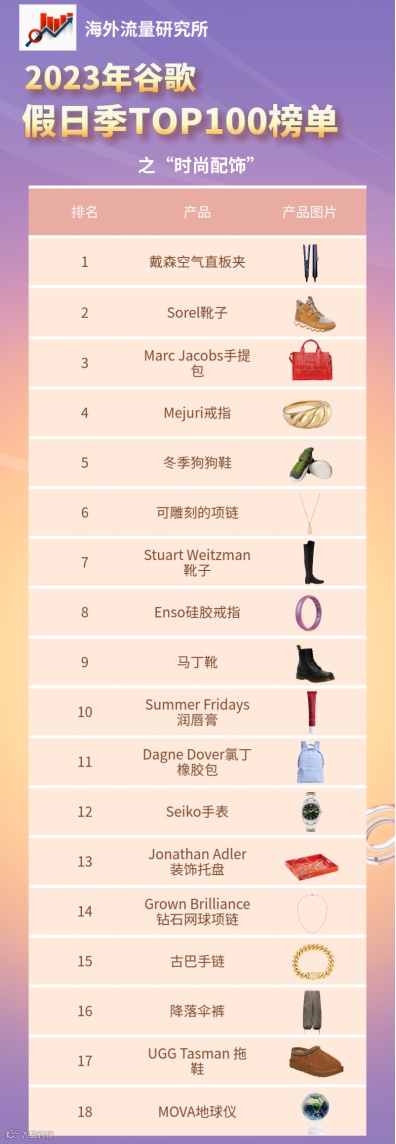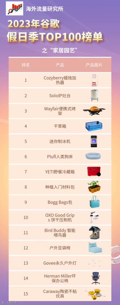 这是Google根据2023年的搜索数据,列出了100种热门搜索产品的购物清单。类目包括了家居与园艺、服装与配饰、电子产品、美容、玩具与游戏以及健康与保健等。