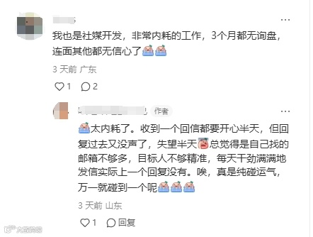 下面有外贸业务员回复说:非常内耗的工作,社媒开发3个月了没询盘;