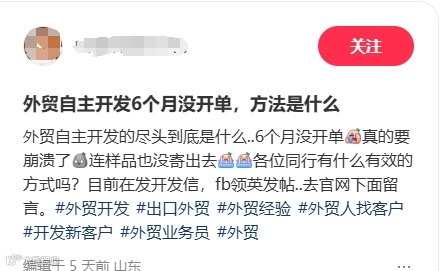 她说6个月没开单,连样品单都没有,快要崩溃了!目前在发开发信,Facebook领英发帖、去官网下面留言等获客。
