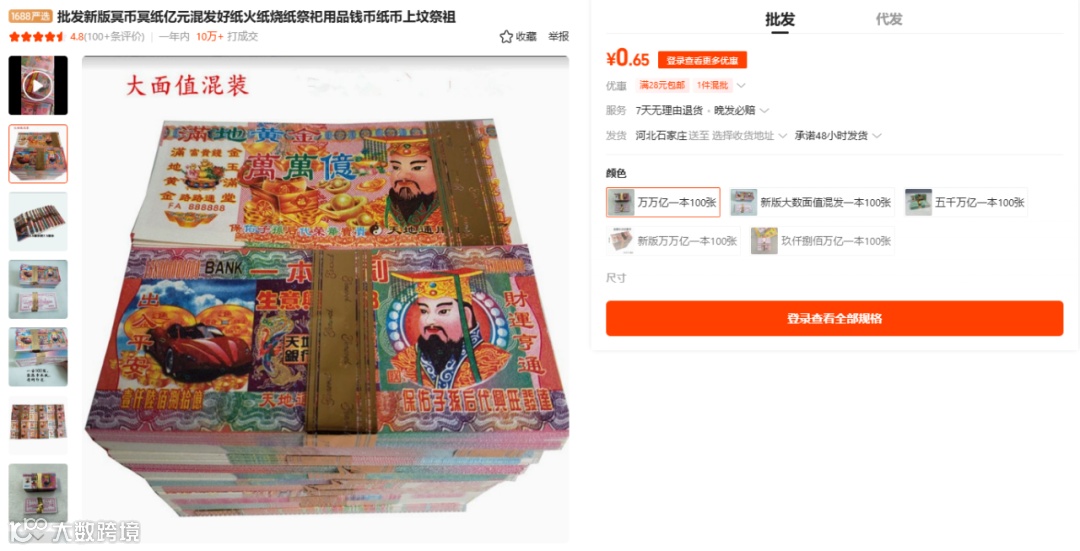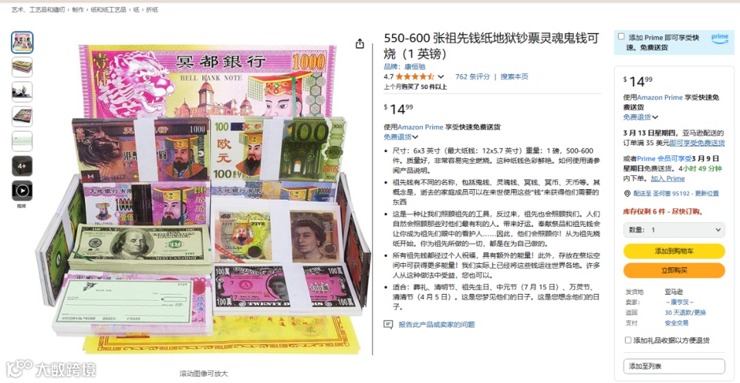 2024年数据显示,“祖先钱”在海外市场搜索量暴涨1800%,订单量同比激增135%。国内1688上价格3.9元的600张冥币在亚马逊售价达110元,溢价高达29倍,吸引中国卖家加速布局。
