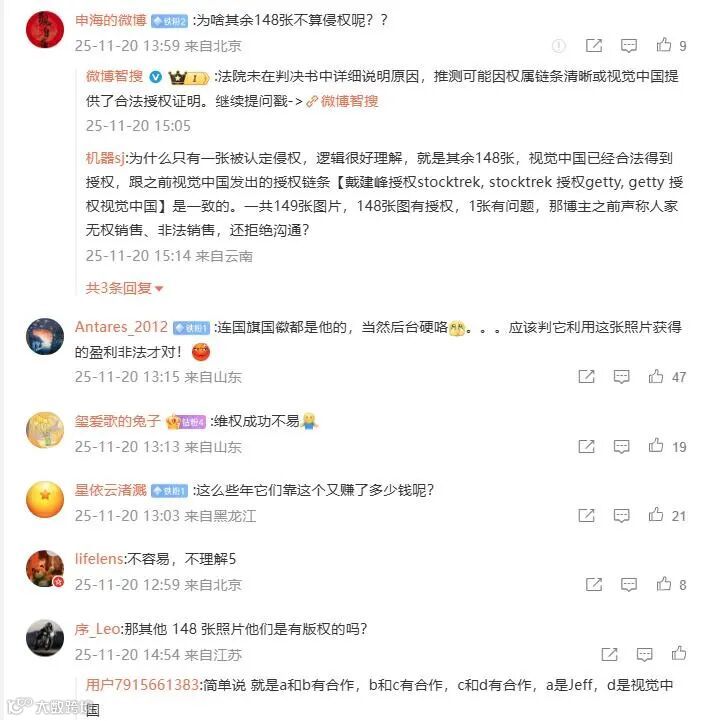 于是,戴建峰公开@视觉中国,要求给出合理解释。并质问视觉中国,从哪里非法获得这些照片进行非法销售?获得了多少非法收益?又拿这些照片,去起诉了多少公司,获得了多少非法收益?
