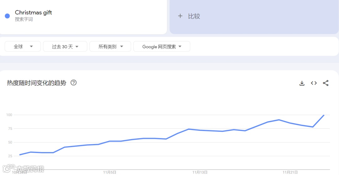 根据谷歌趋势显示,近30天内全球“Christmas gift”一词的搜索热度在25—100之间,随着圣诞节节日渐近,该词热度持续增长至75—100之间。英国、爱尔兰、澳大利亚、美国、加拿大、德国等多国消费者增加对圣诞节礼物的关注。