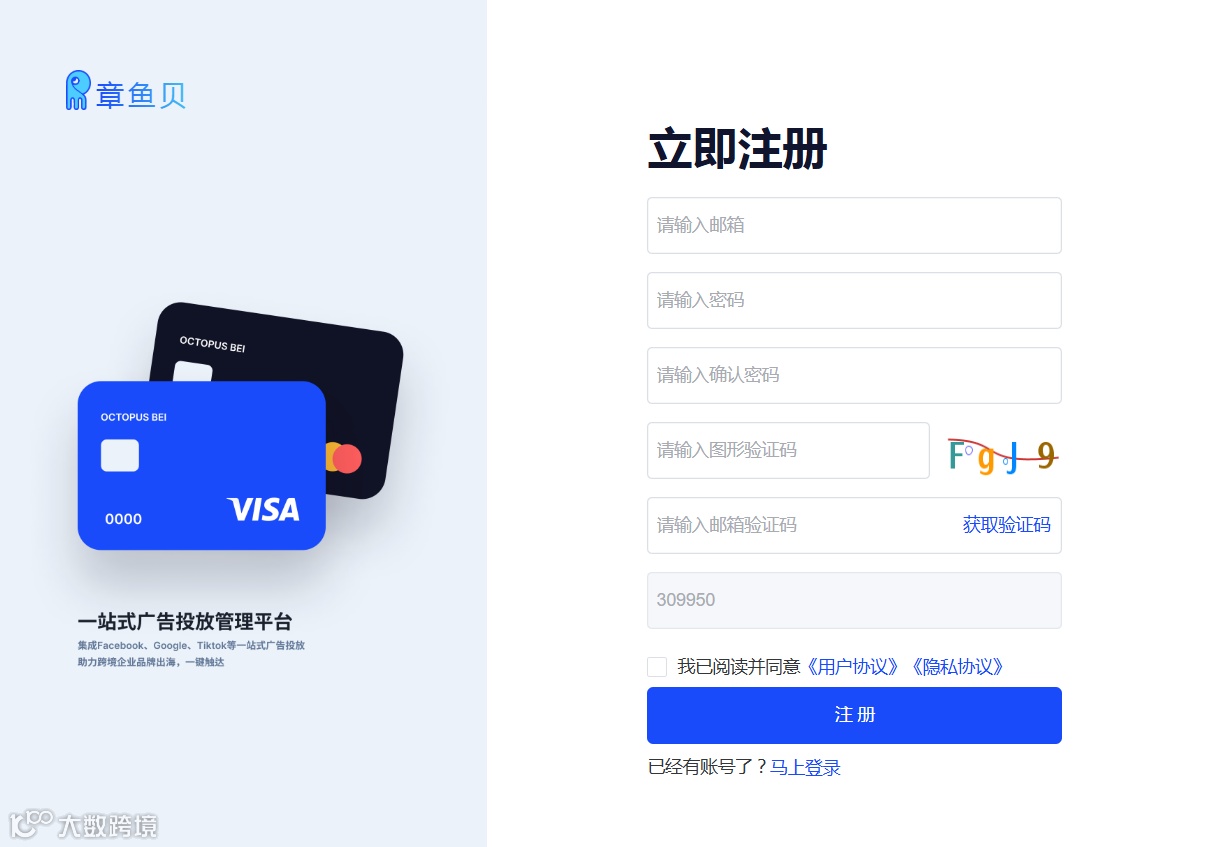 首先,访问章鱼贝虚拟卡台的官方网站,并点击首页的“注册”按钮。