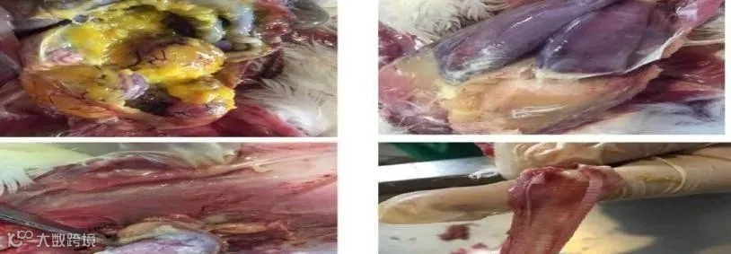 此病的临床症状主要表现为精神沉郁、食欲减退、扎堆、羽毛松乱、腹泻,粪便呈白色或黄绿色,并粘污肛门周围的羽毛;病死鸡剖检主要病变为气管充血粘液、气囊炎、心包炎、肝周炎、腹膜炎等。