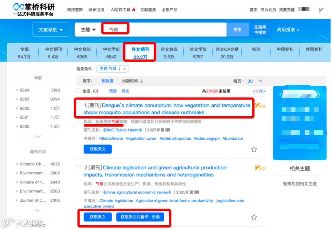咱们直接在页面中输入中文的关键词,掌桥科研可以帮助大家自动翻译成专业术语,并检索出对应的英文文献。