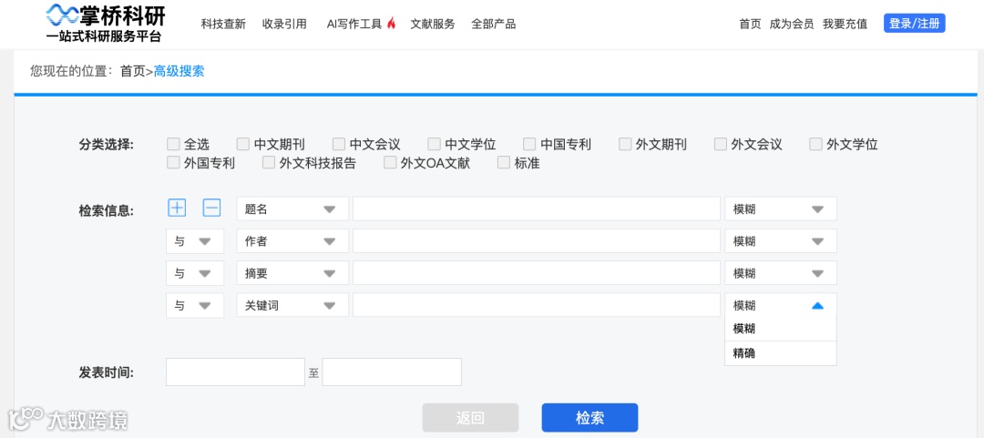 你可以选择分类选择,同时检索作者、摘要和关键词,以及发表时间。