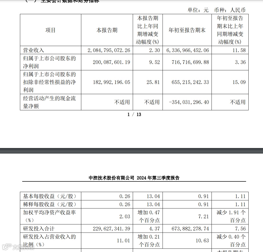 财报显示,2024年前三季度,中控技术实现营收63.37亿元,同比增长11.58%;归母净利润7.17亿元,同比增长3.36%;扣非净利润6.55亿元,同比增长15.09%[k]。但第三季度营收同比仅增长2.3%,净利润增长9.52%,增速明显放缓[k]。
