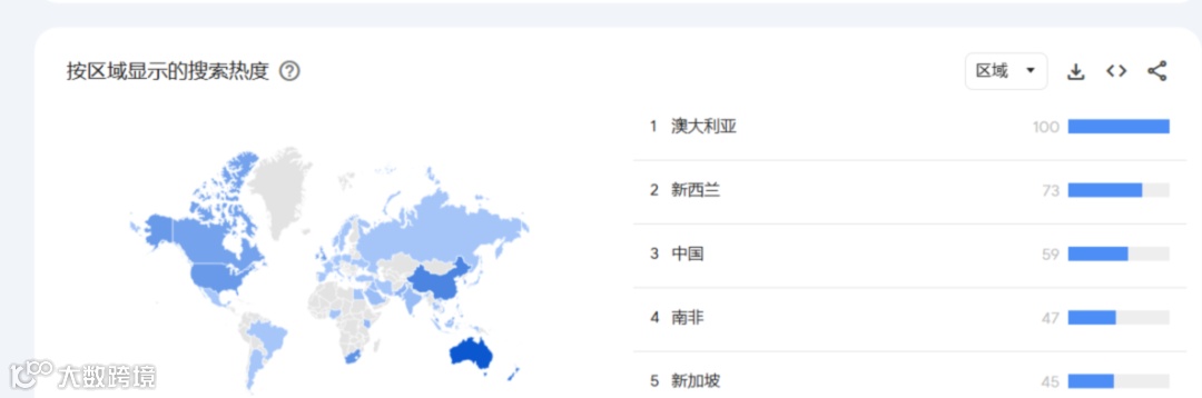 Google trends 只能到国家,例如上图,澳大利亚热度最高,但我想知道澳大利亚哪个城市的热度跟高,Google trends无法满足。
