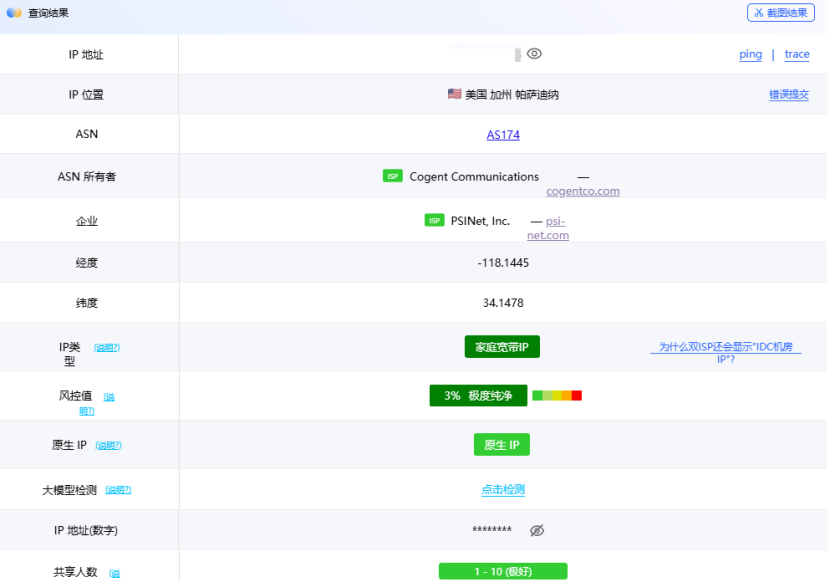 使用IP检测工具查看ASN是否归属明确,指向当地运营商确认