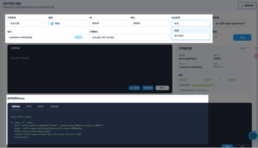 如果你需要一个适用于亚马逊规模化采集的动态住宅IP,IPFoxy是目前业内评价较高的专业服务商之一,因为它能提供真实住宅 IP,节点来自家庭宽带,ASN优质稳定,覆盖全球核心地区,并且支持每请求轮换、粘性会话、API/端口切换,适配不同采集场景。