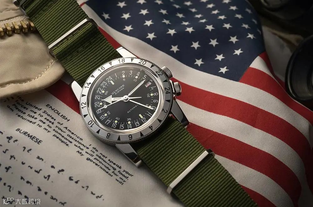 ▲ Glycine Airman. 图片来自:Hodinkee 「GMT」表盘最初为飞行员设计,用于追踪多时区时间。Glycine于1953年推出首款GMT手表Airman,率先实现双时区显示[k]