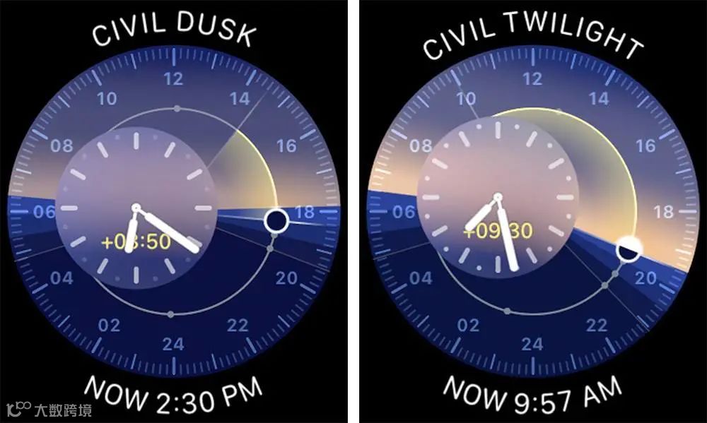 与传统表盘不同,苹果表盘上的太阳与月亮图标根据实际日出日落时间动态调整位置,提升准确性[k]。内圈数字始终保持正立,避免倒读困扰,并通过弧形阴影直观区分昼夜[k]。