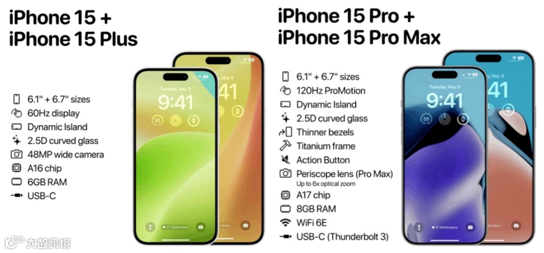 刷新率120Hz,钛合金中框、固态按键,还独占了A17处理器、8GB内存、潜望式长焦、WiFi 6E。