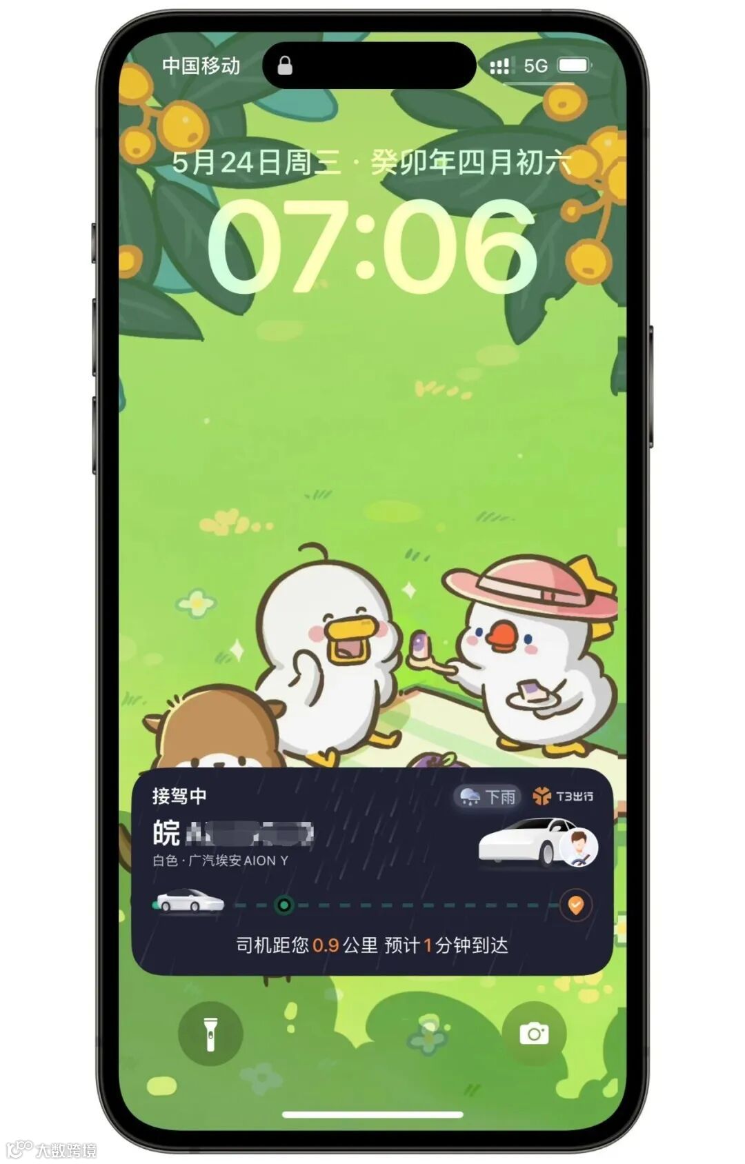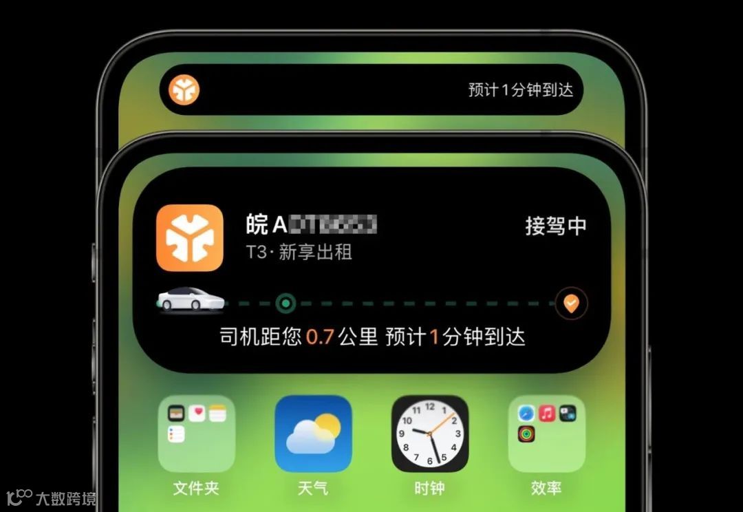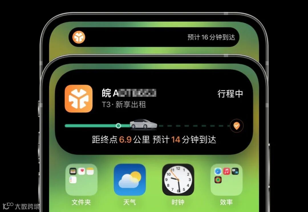 但换iPhone 14 Pro没多久,我就发现用T3出行叫车,灵动岛可以实时提醒司机还有几分钟到达,长按还能显示车牌号、车型等我们关心的内容。