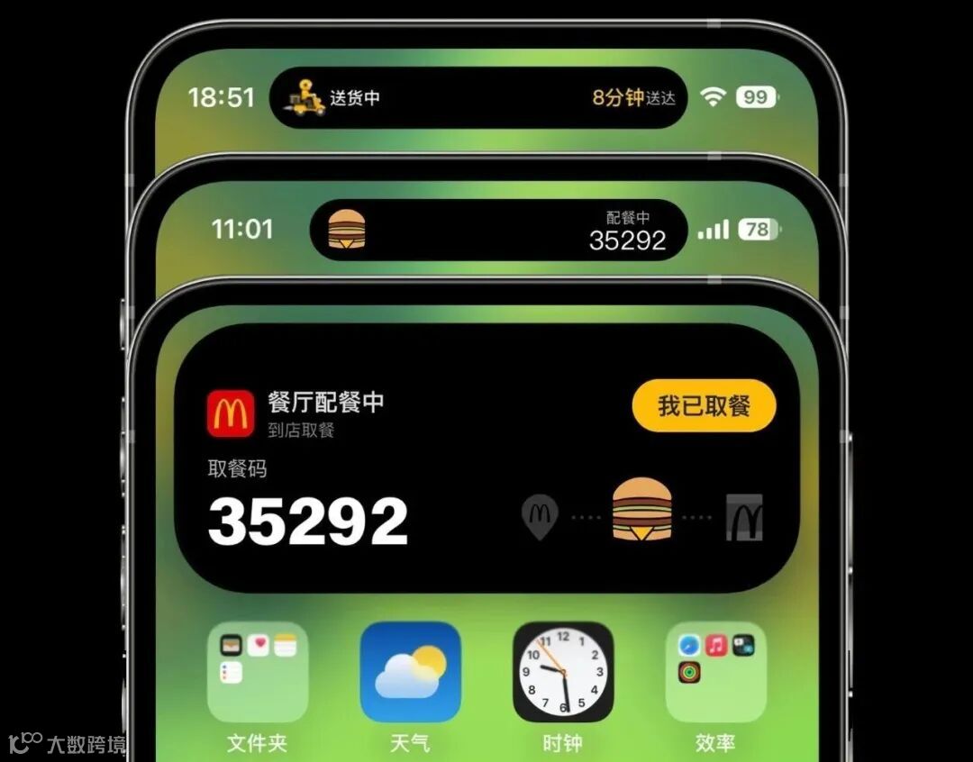再比如,咱们用美团、饿了么等外卖软件时,可以通过灵动岛实时查看骑手的配送进度;吃肯德基、麦当劳时,也可以在灵动岛直接看到取餐码。